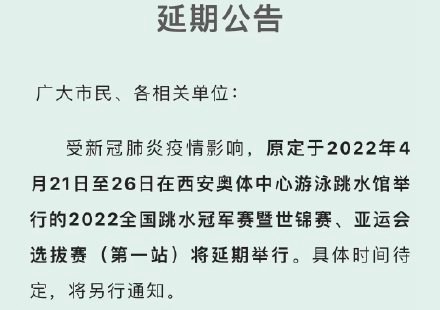 目前全国跳水冠军赛因疫情原因,已经正式延期了,具体官方尚未给出赛程。