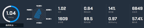 Rating的数据在1.04现阶段来说或是有目共睹的,KA上来说还是挺不景气的1.02的数据,magixx的爆头率十分的浮夸达到57.4%的数据。