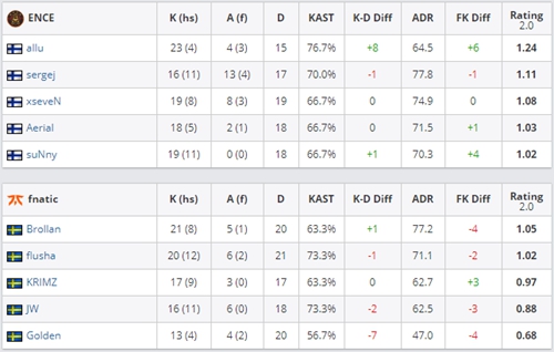 第一张地图来到ENCE选择的Dust2,flusha前面的发挥非常精彩,拿到了一次让人叹为观止的四杀,但是此后FNC直接哑火,allu直接超神发挥帮助ENCE打出11-4的超大比分。FNC后续拿下进攻方手枪局后开始稳扎稳打来应对,可惜allu已经状态起飞势不可挡,最终ENCE还是以16-14的惊险比分咬下第一局。