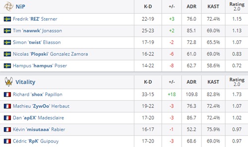 来到Dust2,NiP一扫前一张图的低迷,凭借hampus稳健的B点防守几波顶住Vitality的进攻,最后开局6-0的NiP比分已经被追到8-7,下半场,shox依旧为队伍提供优质的火力输出,在他的带领下,Vitality的队员逐渐找回状态16-13赢下比赛。