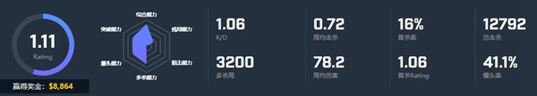 Rating的数据在1.11这个数据还是非常不错的,他的个人综合能力以及多杀能力还是比较突出的,总体来说这位选手各项数据都均衡。